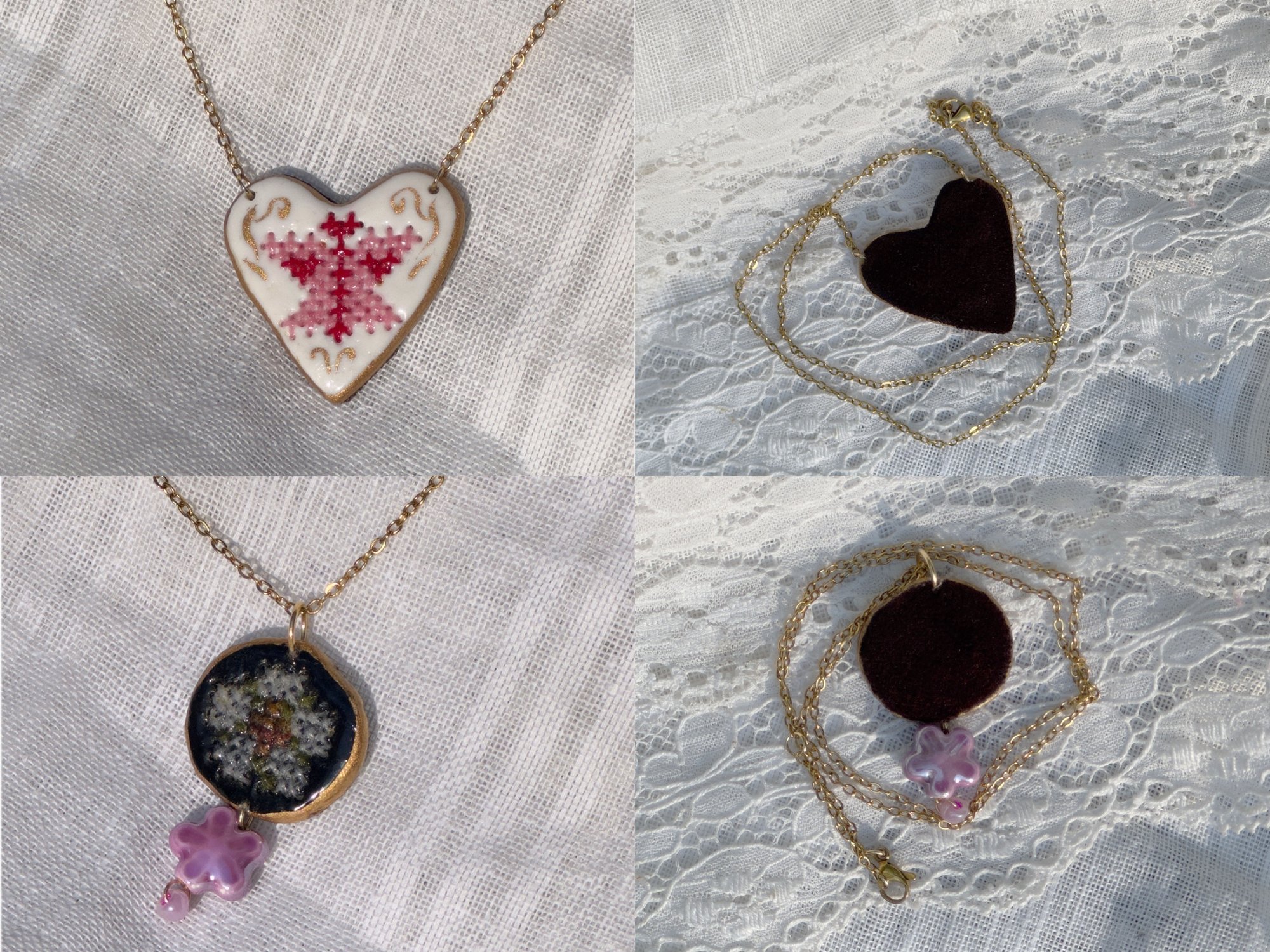 Hand stitched antique inspired designs on white and black polymer clay. 💖 🌸